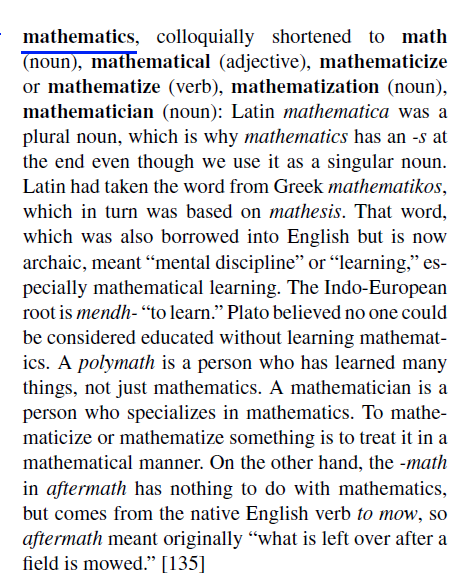 The word mathematics comes from Ancient Greek máthēma (μάθημα), meaning “that which is learnt”,[11] “what one gets to know”, hence also “study” and “science”. The word came to have the narrower and more technical meaning of “mathematical study” even in Classical times.[12] Its adjective is mathēmatikós (μαθηματικός), meaning “related to learning” or “studious”, which likewise further came to mean “mathematical”.[13] In particular, mathēmatikḗ tékhnē (μαθηματικὴ τέχνη; Latin: ars mathematica) meant “the mathematical art”.[11]